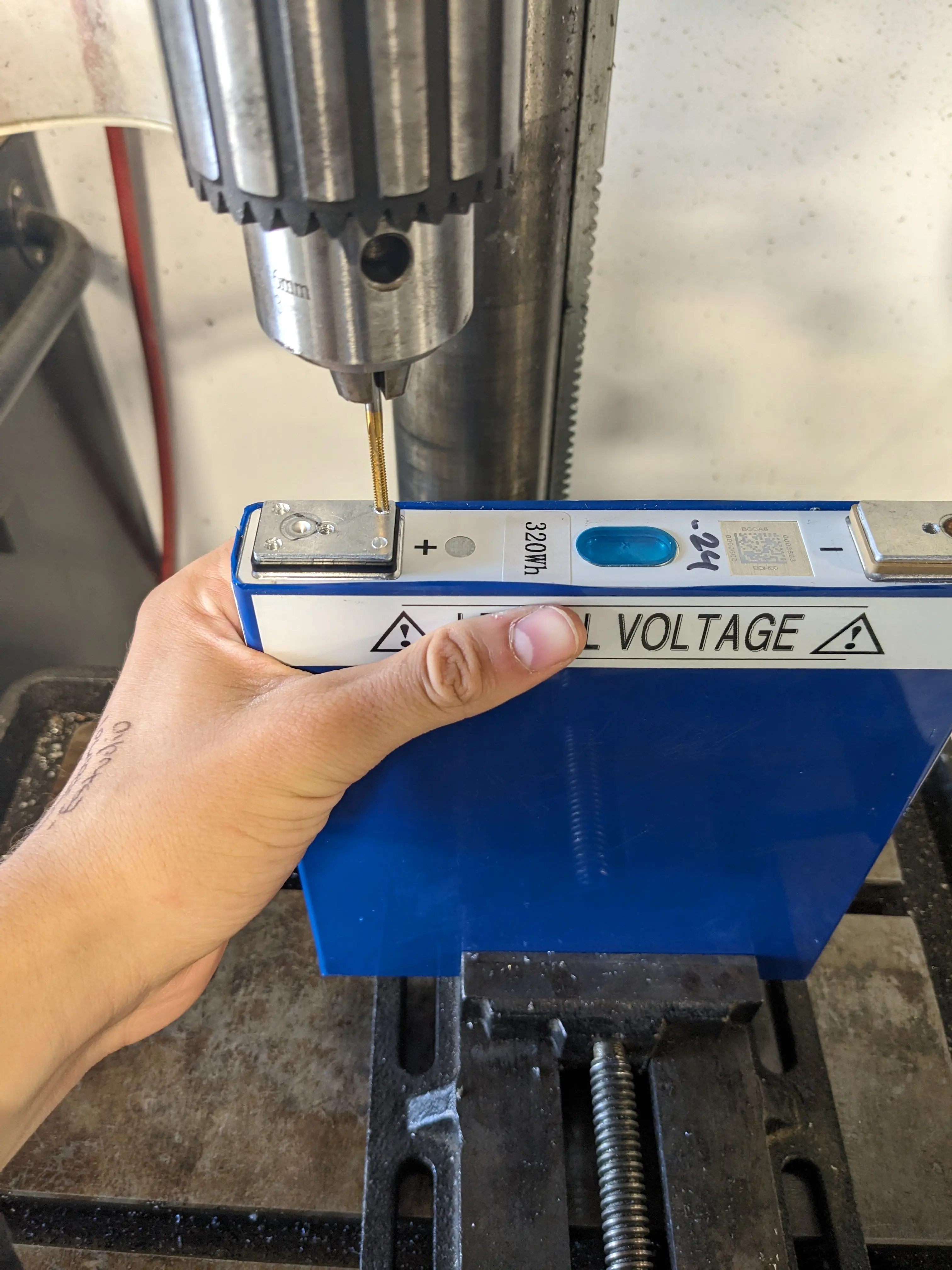 Once Tim made the part to be attached to the battery terminals, I marked the hole location, drilled the batteries (again) and tapped those holes.