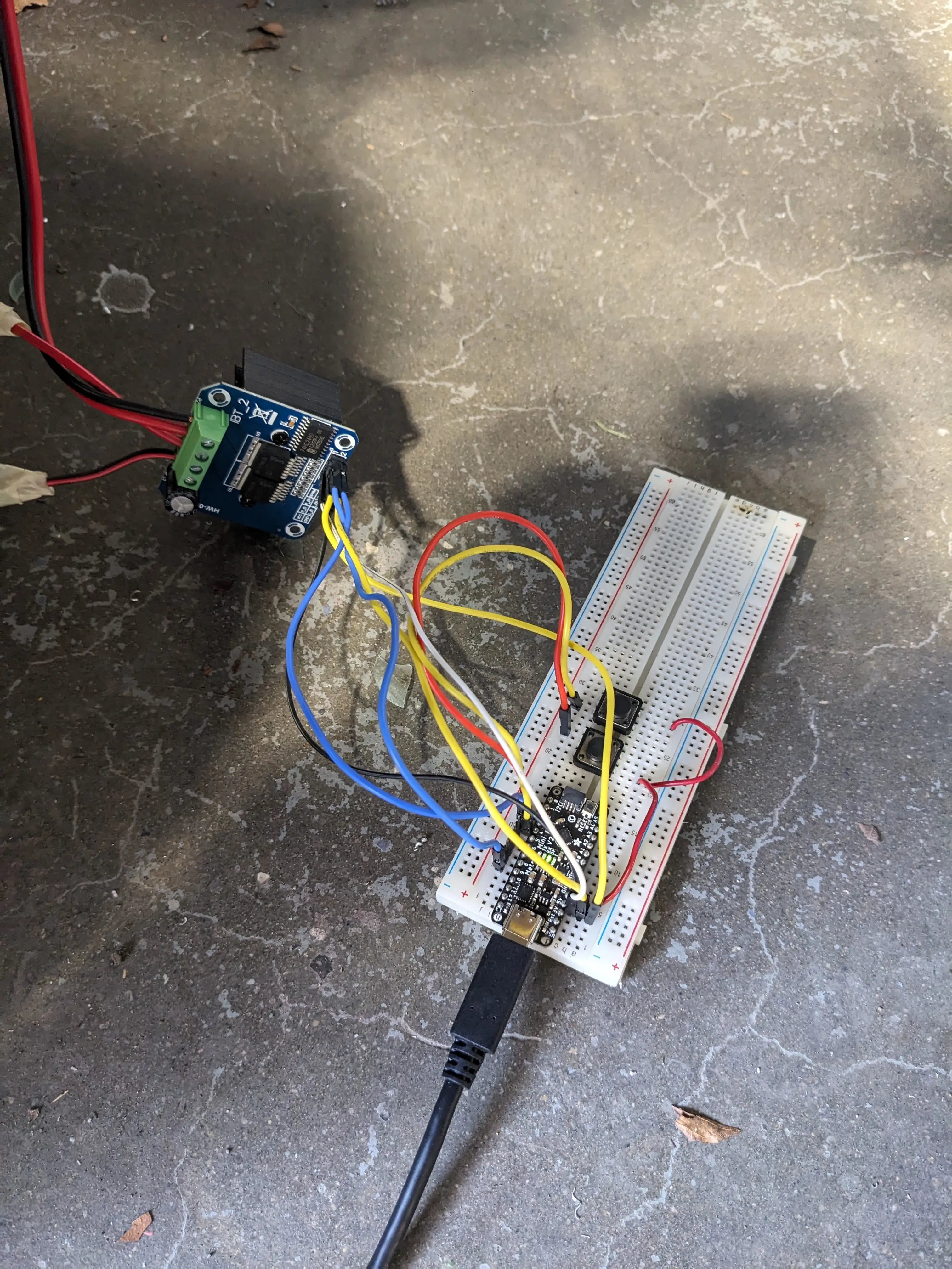 I wired up a simple breadboard circuit with an Arduino and the BTS7960 motor driver (capable of 49 amps continuous, which I am skeptical about) which is then wired up to a 30a 12v power supply and the giant steering motor.