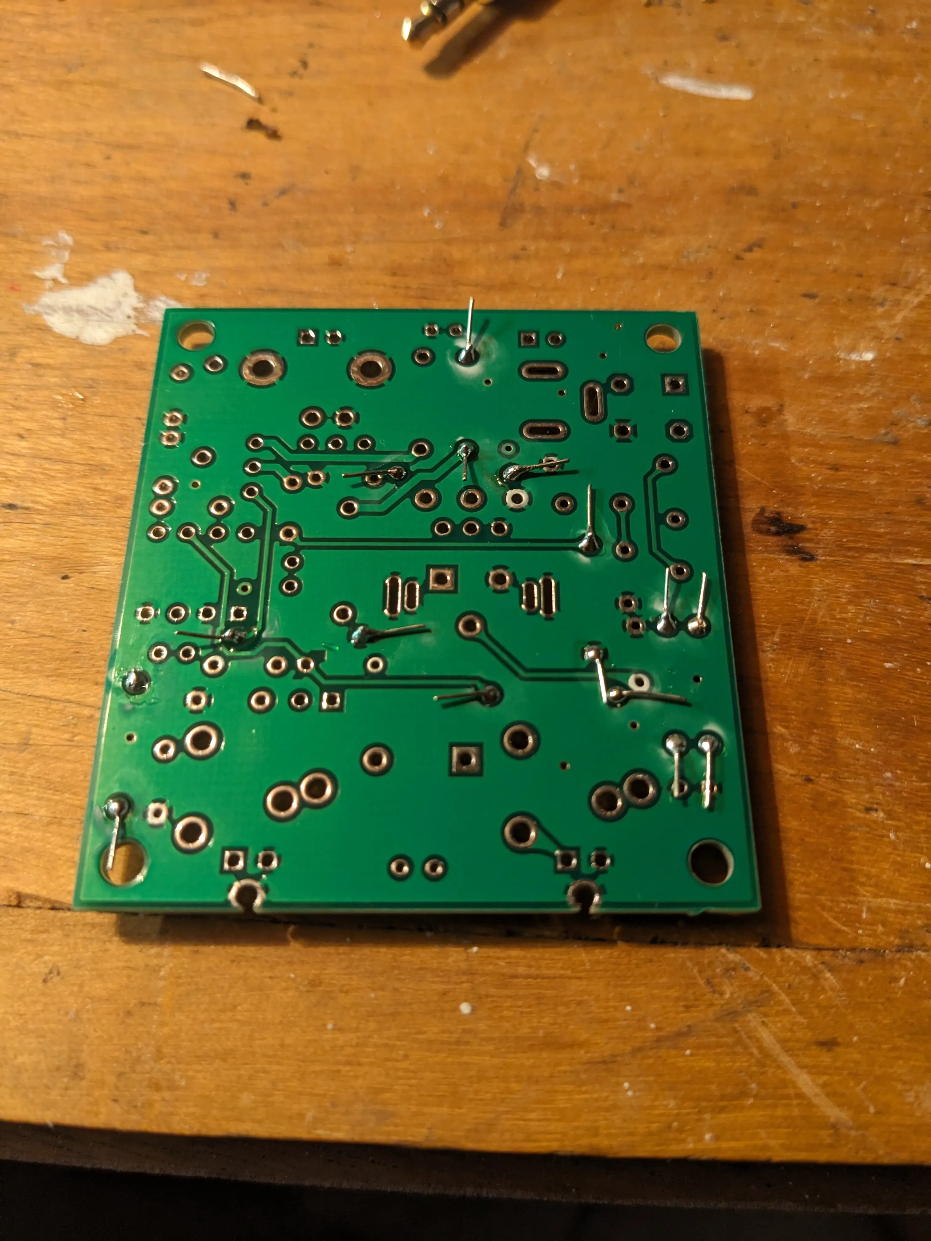 Once I had those two documents, I began the assembly process. First, I started with the resistors, which I used a multimeter on the ohm setting to verify the resistance of each component. I then matched each one to the paper and the corresponding number on the PCB silkscreen (R1, R2, …) and pushed them through and soldered their legs. This part definitely wasn’t my cleanest soldering, but it worked just fine.