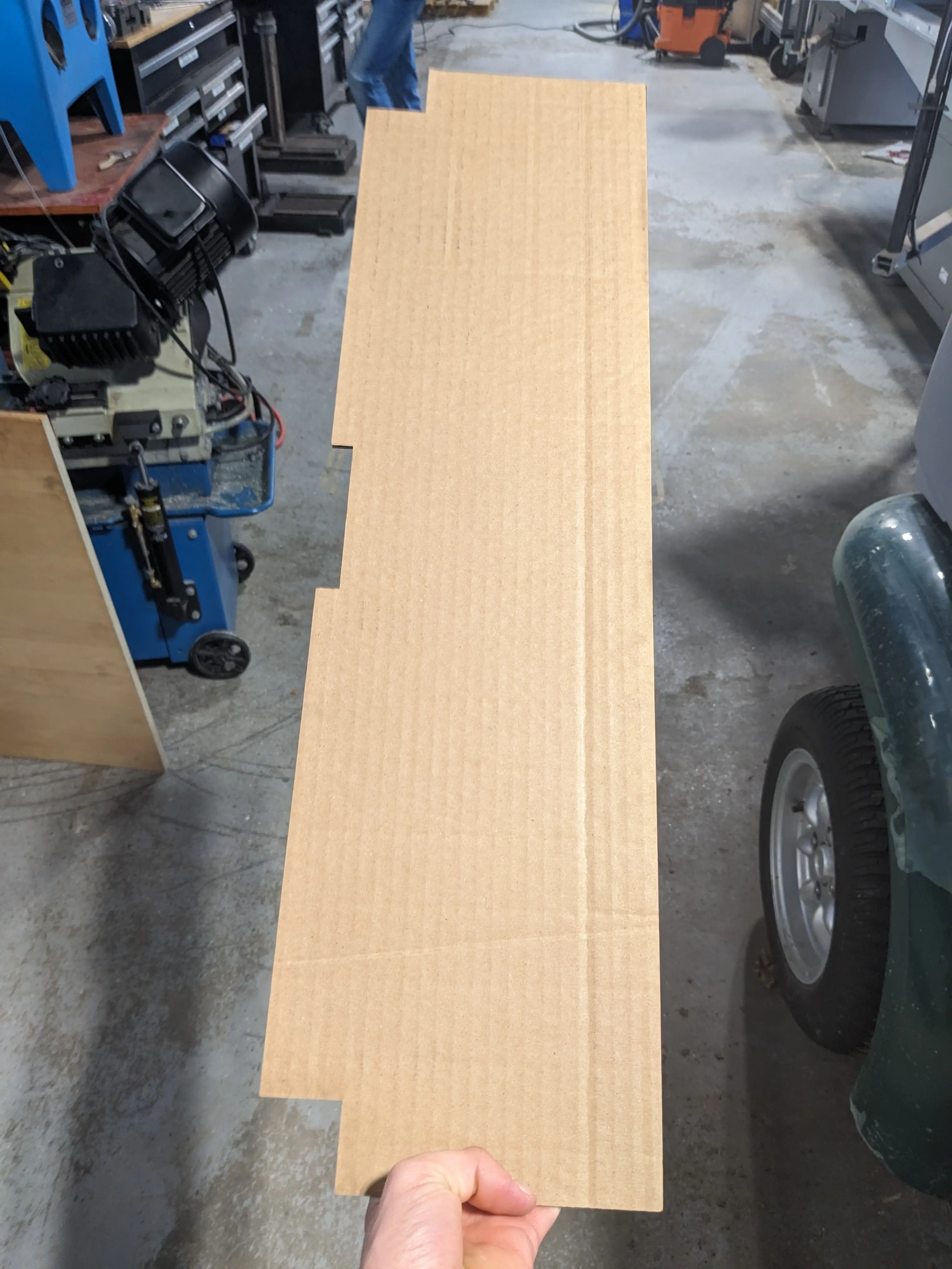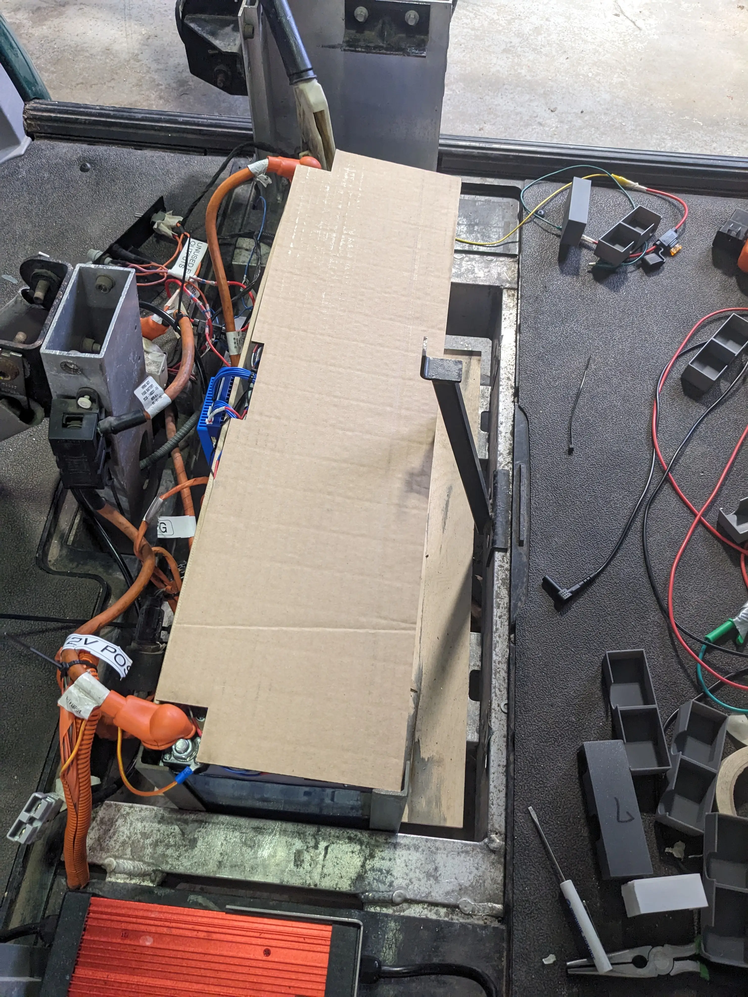 I decided to come up with a better solution. I made a simple sketch in Fusion 360 that would cover all the battery-related electronics from the top down. I then lazer cut a quick sanity-check out of cardboard which looked promising.