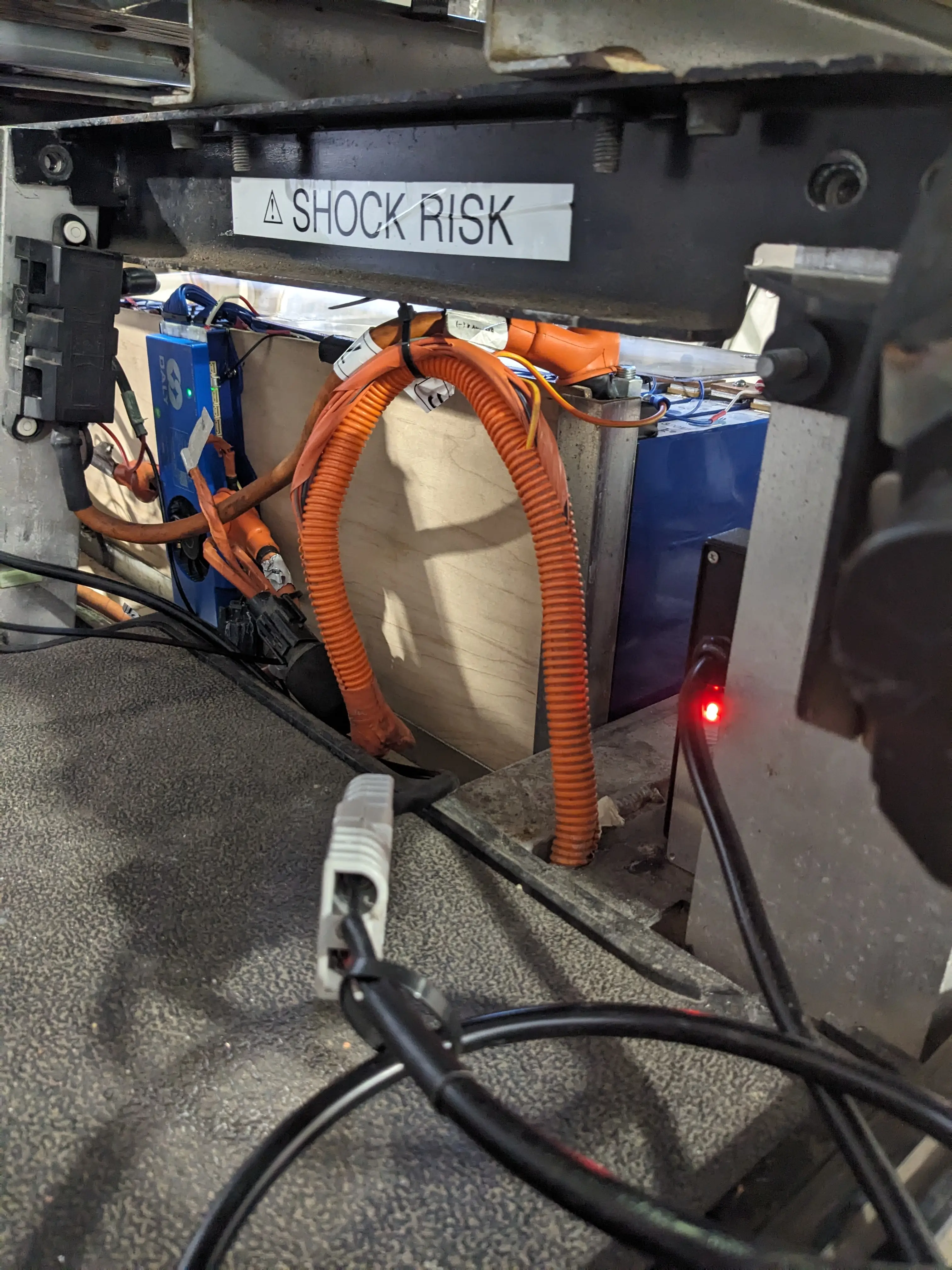 To start off the week, we had to identify what was making the BMS and batteries upset in the first place. To do this, I read voltage between the battery terminals (+/-) and the frame of the entire golf cart. I immediately noticed that the negative pole on the batteries were connected to the frame, which is bad. We already knew this, but I confirmed that the 80 volt battery system is supposed to be electrically isolated from everything.