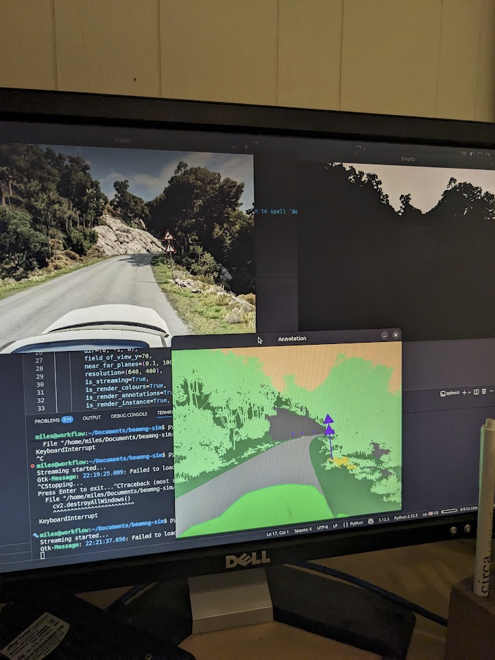 I was able to mount a camera to the top of a vehicle and get a live stream running all through their provided BeamNGpy library written in Python. This will be fun to train and experiment on, without needing to drive the real golf cart and risk potential damage or injuries.