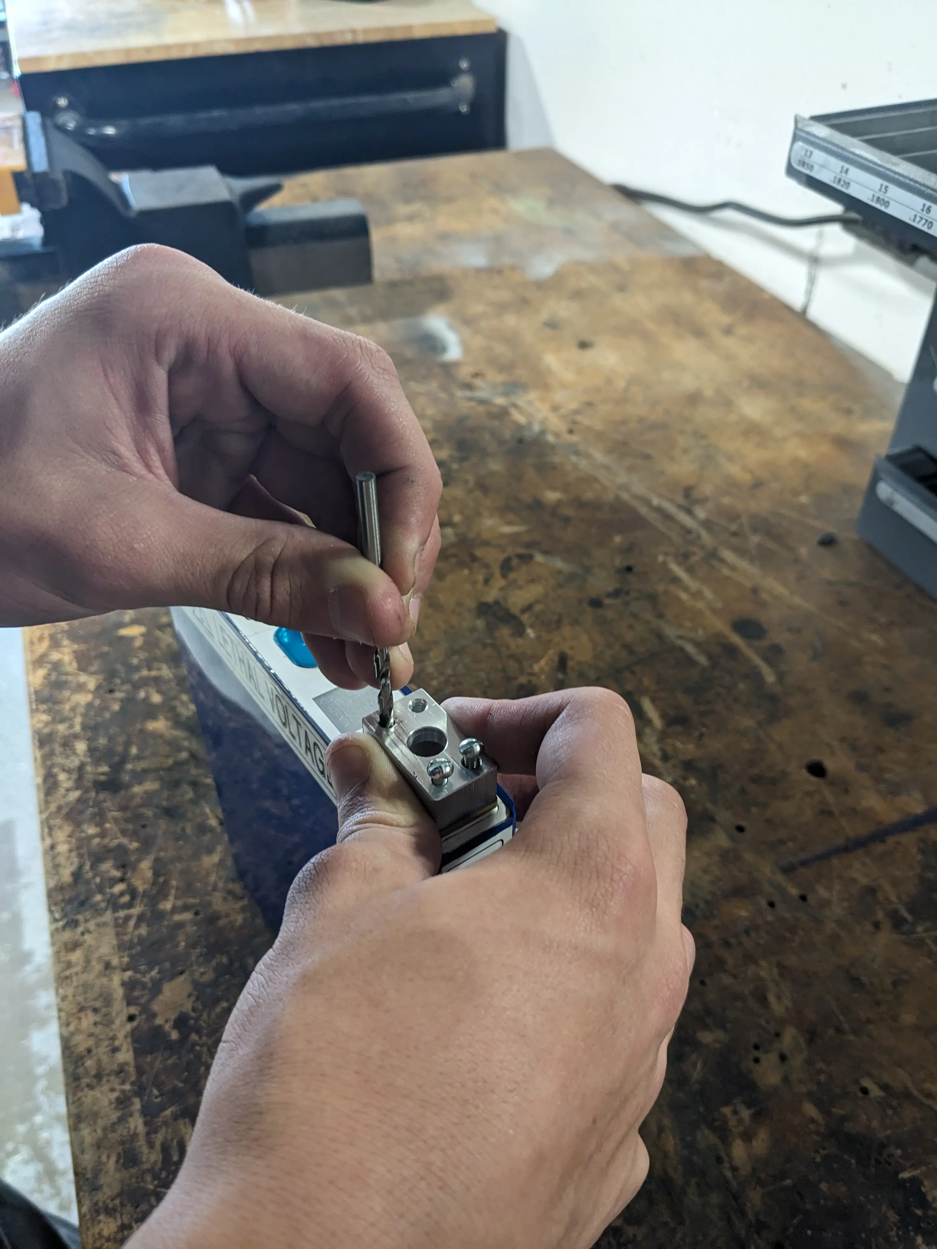 Once Tim made the part to be attached to the battery terminals, I marked the hole location, drilled the batteries (again) and tapped those holes.
