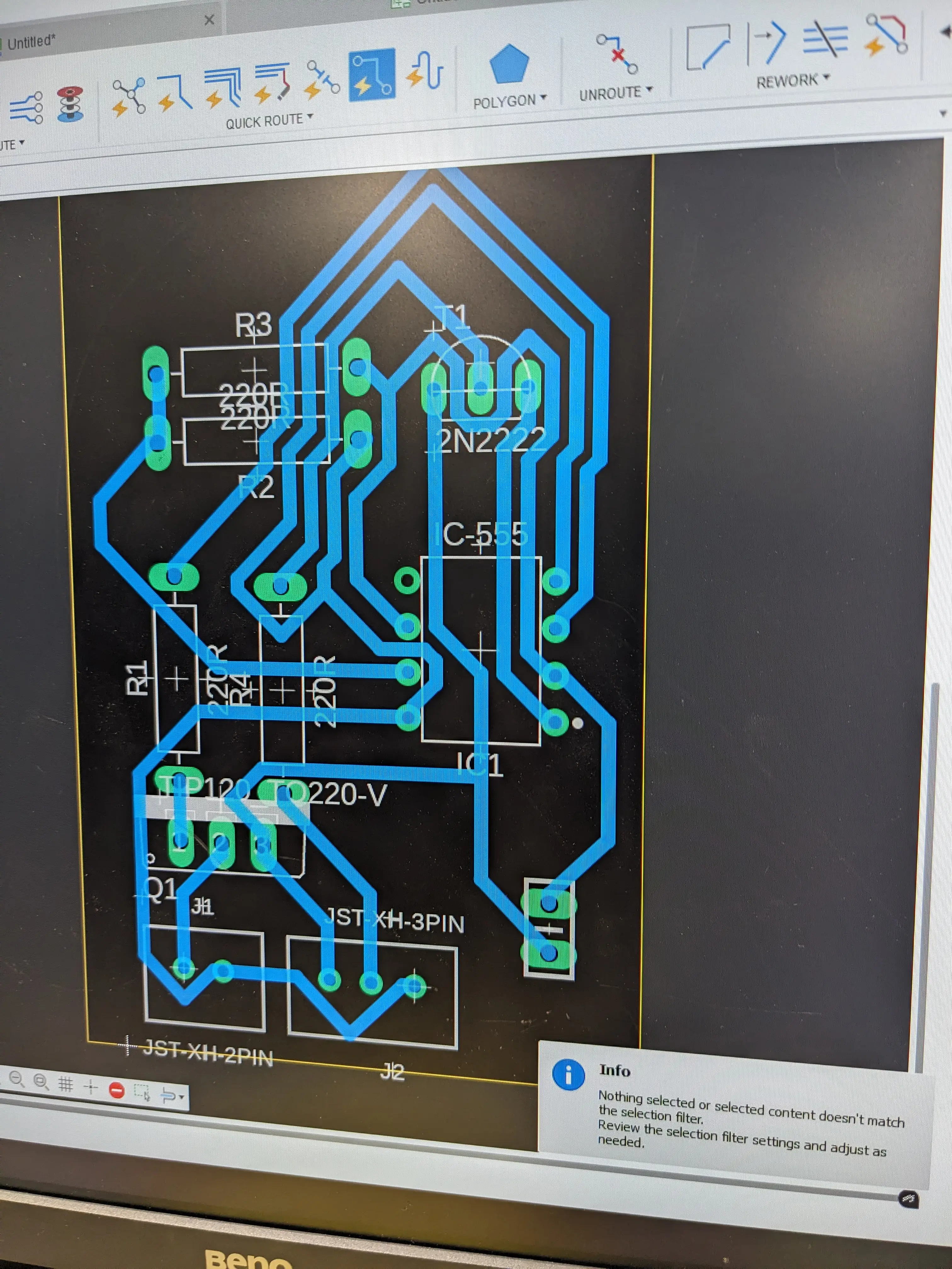 I let Jonas build a prototype on the breadboard with a LED which worked out just fine. After that was confirmed to work, I helped him transition his work to a circuit schematic and eventually a PCB layout.
