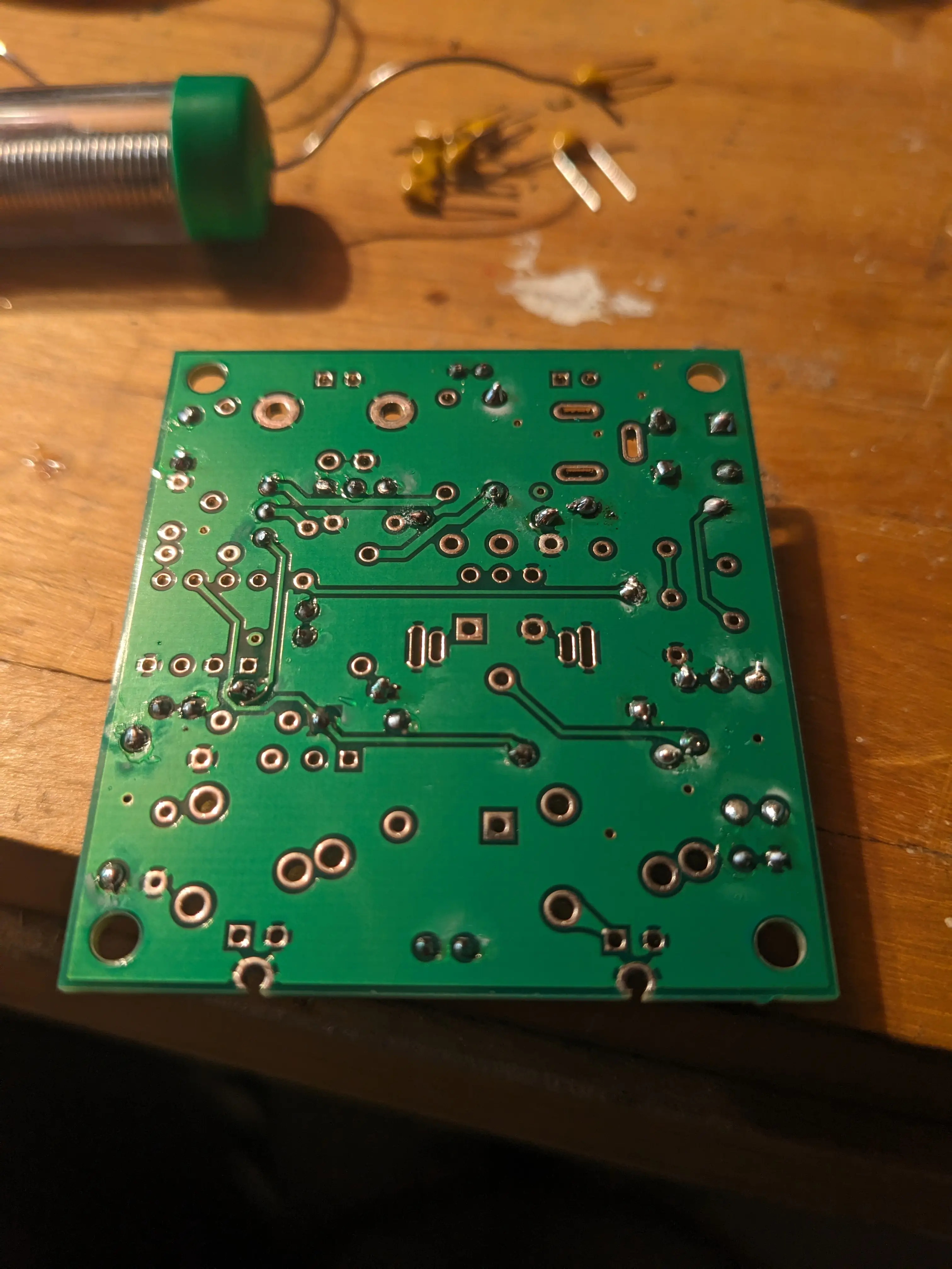 Once I had those two documents, I began the assembly process. First, I started with the resistors, which I used a multimeter on the ohm setting to verify the resistance of each component. I then matched each one to the paper and the corresponding number on the PCB silkscreen (R1, R2, …) and pushed them through and soldered their legs. This part definitely wasn’t my cleanest soldering, but it worked just fine.